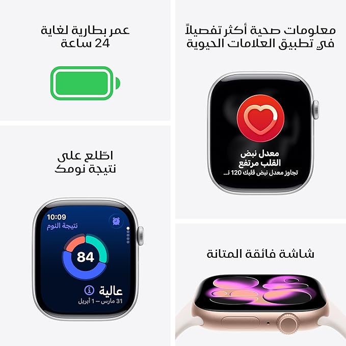 - تصميم يدوم معك — مع شاشة فائقة المتانة من الزجاج، أقوى 2x من Series 10 في مقاومة الخدوش. تتمتع Series 11 أيضاً بمقاومة للماء لغاية عمق 50 متراً ومقاومة للغبار ضمن تصنيف IP6X